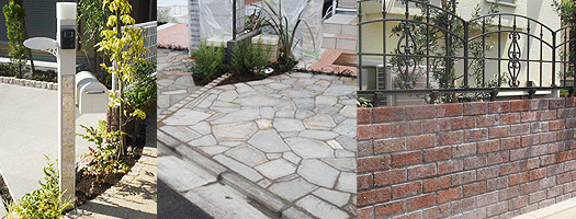 外構工事(天然石乱貼り・機能門柱・レンガ・フェンス)