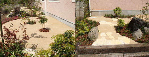 しっかりと固まるので雑草を防ぐことが出来ますし、透水性があり水が溜まりにくく、また、照り返しを抑えることもできます。