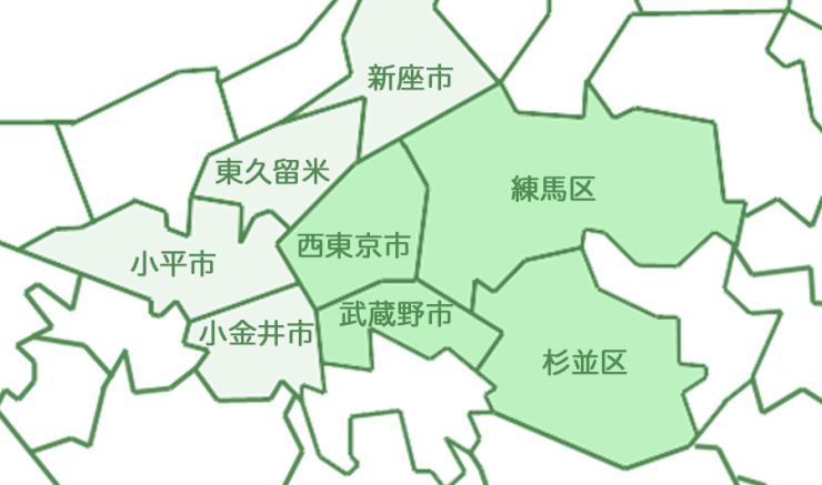 対応エリア アグリーガーデンは地元密着!小さいエリアで迅速対応! 西東京市・武蔵野市・練馬区・杉並区 主に西東京市・武蔵野市・練馬区・杉並区で営業しております。 東久留米市・小平市・小金井市・新座市も対応可能ですので、ぜひご相談ください。